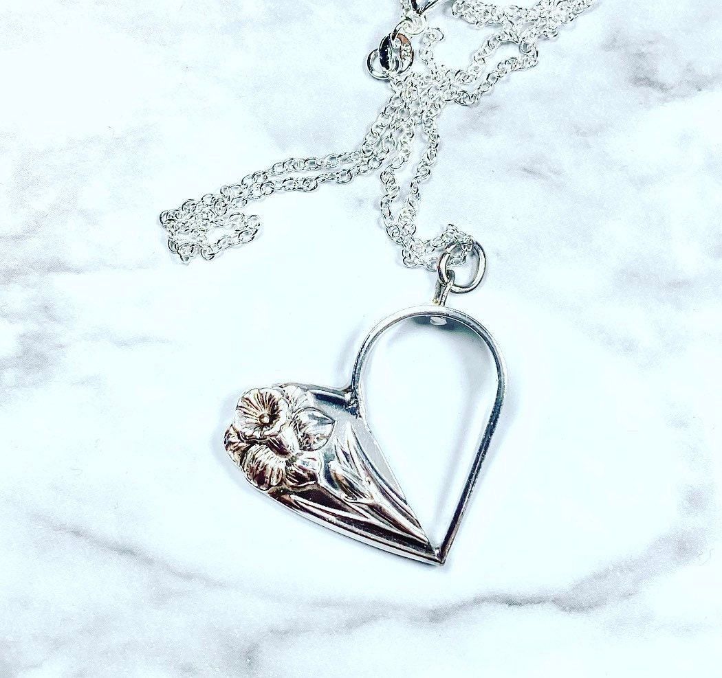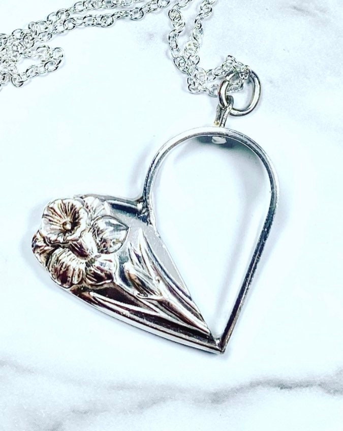 This stunning heart necklace is made from a vintage fork! The pattern is called Daffodil from 1950. The heart is made from the end of the fork handle and one of the fork tines that have been soldered together!!! These necklaces are lightweight and make fantastic gifts for birthdays, anniversaries, or even Mother’s Day!