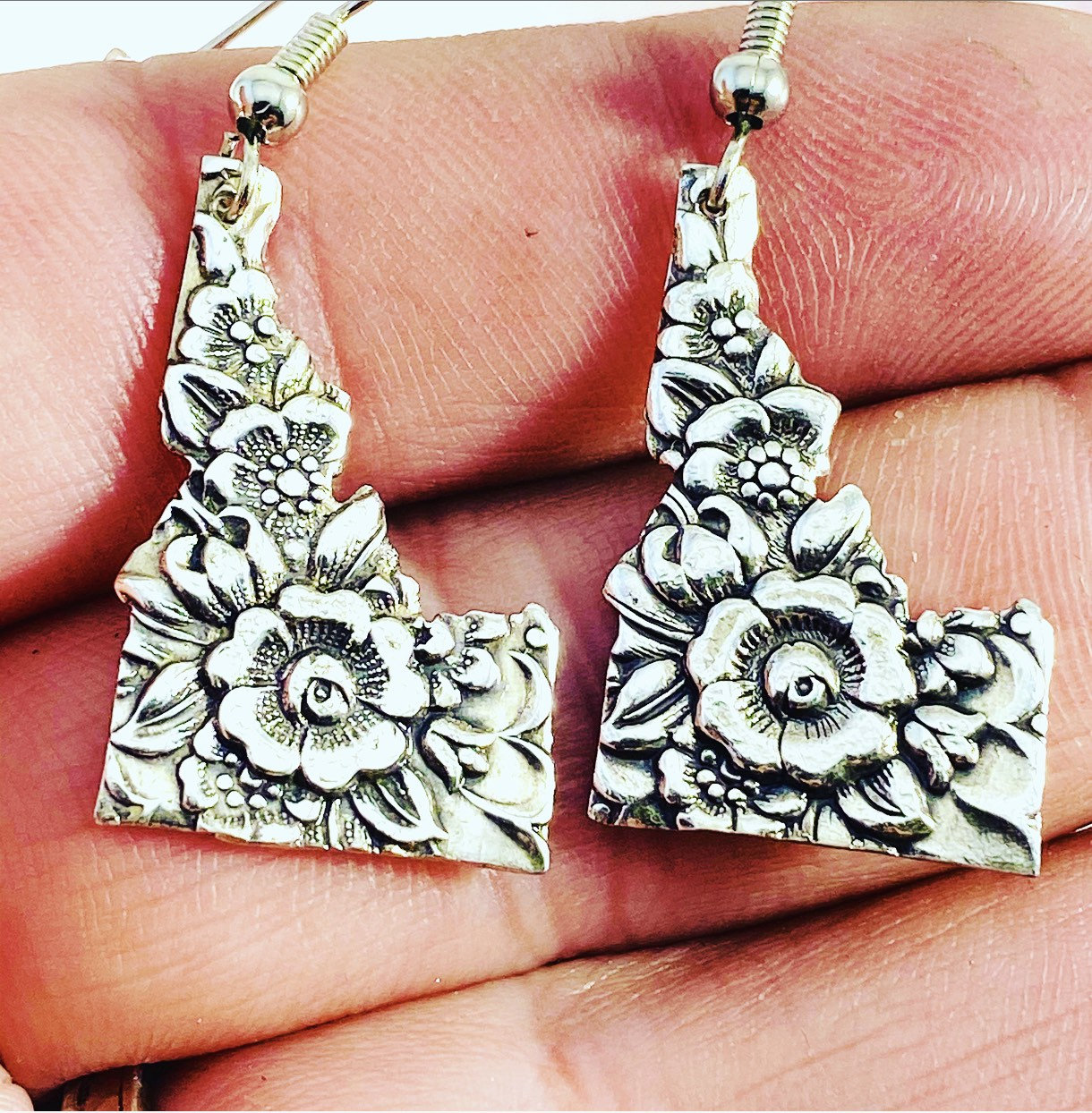 These adorable Idaho earrings are made from a vintage silver plated knife handle called Jubilee and it is from 1953! Each Idaho cutout measures 1” x 5/8” at widest point.